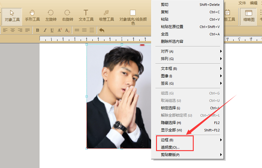 除此之外还可以对图片进行添加边框和修改透明度的操作,在对象工具模式下单击图片后右击选择对应功能操作即可。