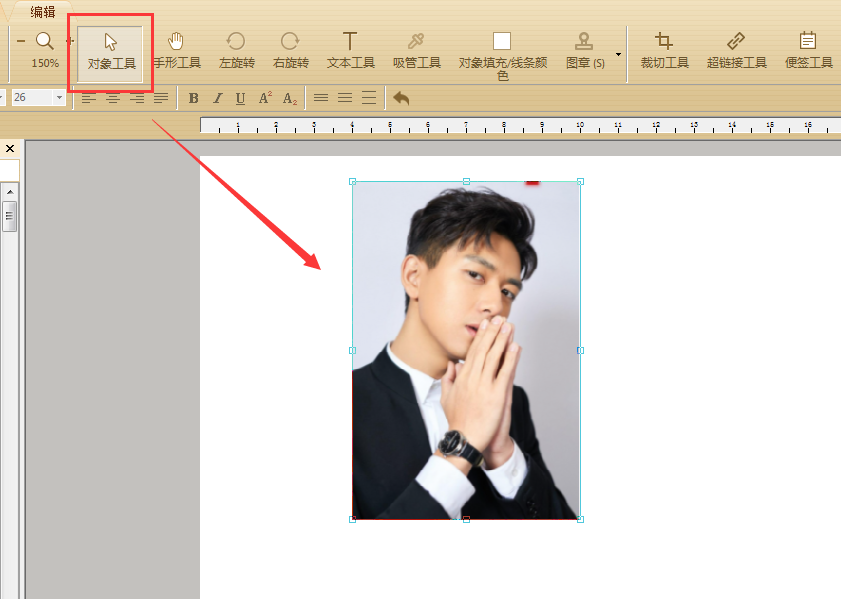 首先我们需要用极速PDF编辑器打开需要修改的PDF文档,选择软件工具栏中的“对象工具”后,单击即可选中并用delete键删除该图片。