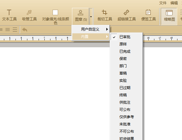 首先我们用极速PDF编辑器打开需要修改的PDF文档后,在中间的菜单栏就可以看到图章工具,点击右侧下拉三角可以看到包括用户自定义和内置这两种,顾名思义就是第一种添加自己制作的图章,第二种则是系统自带的常用图章。