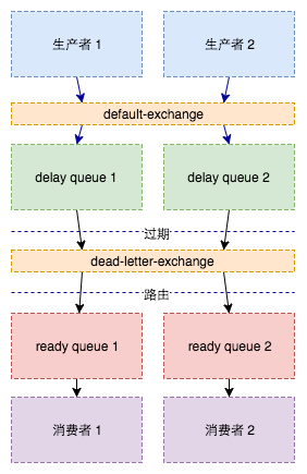 - 一个消息比其他消息提前过期,提前过期的消息会被提前路由到队列,不需要为不同延迟的消息创建单独的消息队列。