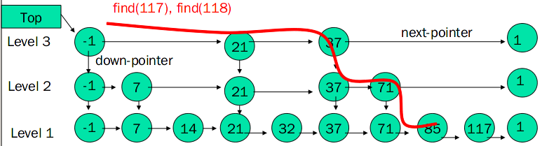 - 如果一个元素出现在Level i的链表中,则它在Level i之下的链表也都会出现