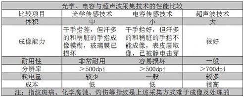 目前得到大量普及指纹图像采集设备,基本上基于三种技术基础:光学技术、半导体硅技术、超声波技术。各种传感技术各有优劣。
