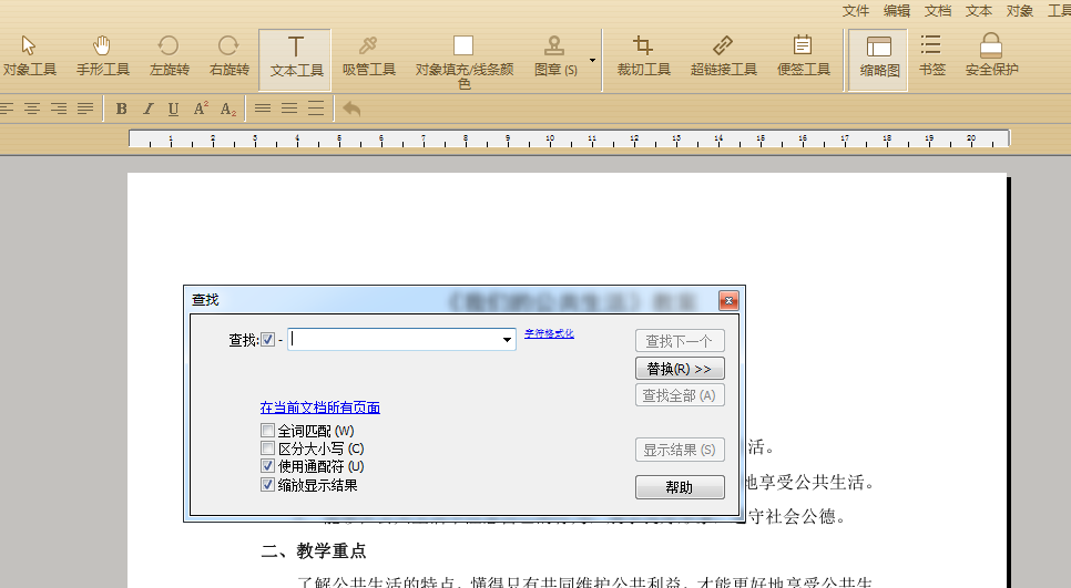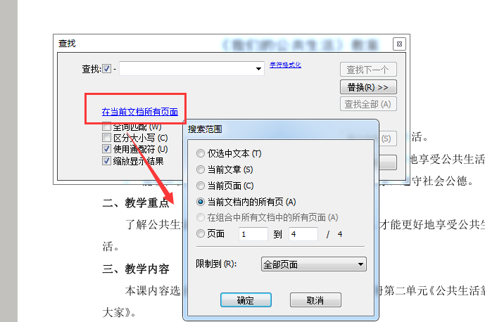 除此之外点击“在当前文档所有页面”还能对查找的页面范围进行限制查找。