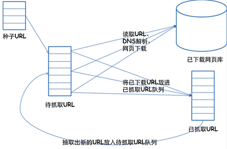 3.取出待抓取的URL,下载并存储进已下载网页库中。此外,将这些URL放入待抓取URL队列,进入下一循环;
