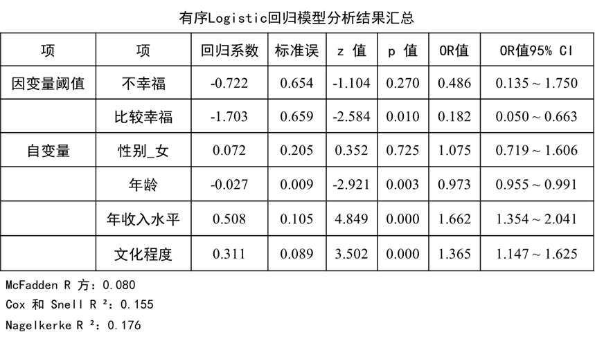首先可针对任意一个R方值进行描述,一般是McFadden R 方为0.08,意味着自变量仅解释幸福度8%的原因,logistic回归时R方值一般都比较小,一般不用过多理会。