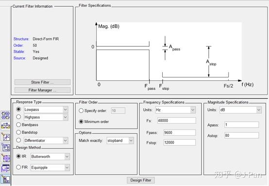 除了butter函数外,当然我们不需要记住其他的命令,当需要其他类型的IIR时,打开MATLAB,在命令行输入:filterDesigner或者fdatool(老版MATLAB),你就能看到如下界面: