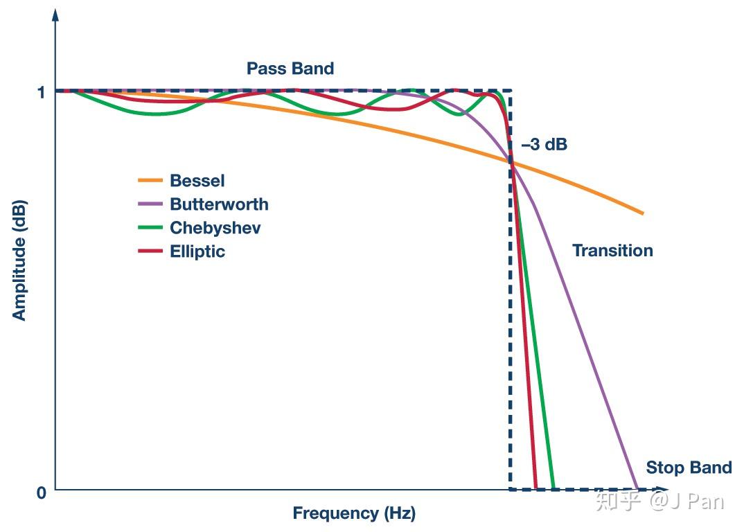 - Bessel(贝塞尔)滤波器:通带内有较好的线性相位;