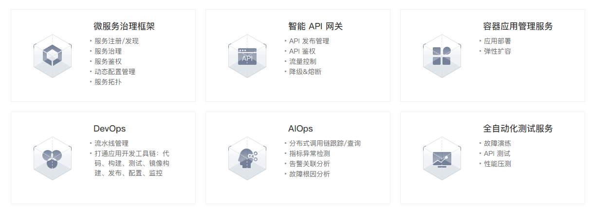 完整的解决方案,网易云认为,应该包括微服务治理、API 网关、容器服务、DevOps、AIOps、和测试服务等 6 个模块,所以,网易云轻舟微服务的功能是这样设计的: