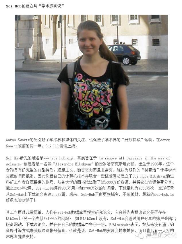 sci-hub的创始人是哈萨克斯坦的一个女研究生,苦于自己太穷下不起论文,一言不合自己写了一个网站,供全球科研工作者下载论文。到现在有800万的用户,3700万的访问,7000多万次的下载。按照10美元一次下载计算,他为科研工作者节省了7亿美元。