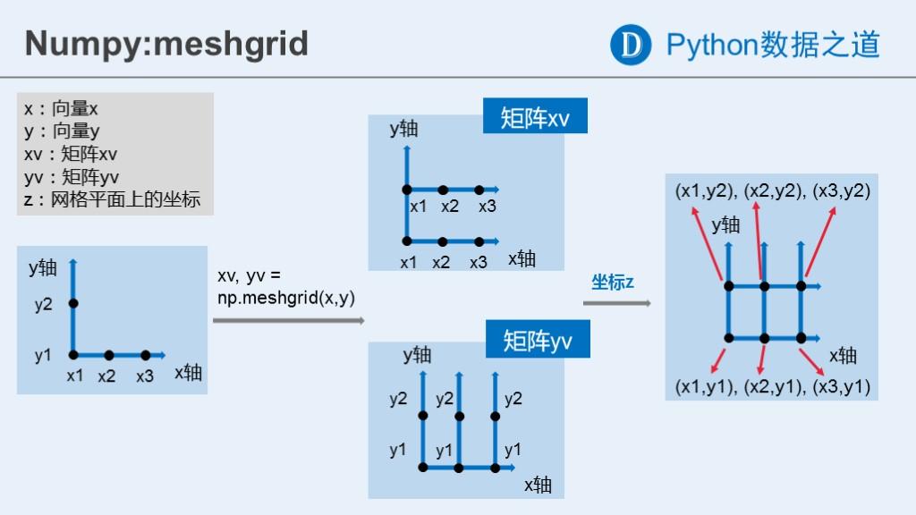 meshgrid函数的运行过程,可以通过下面的示意图来加深理解: