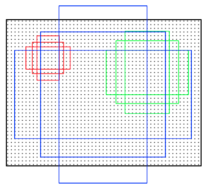 接下来是anchor的窗口尺寸,这个不难理解,三个面积尺寸(128^2,256^2,512^2),然后在每个面积尺寸下,取三种不同的长宽比例(1:1,1:2,2:1).这样一来,我们得到了一共9种面积尺寸各异的anchor。示意图如下: