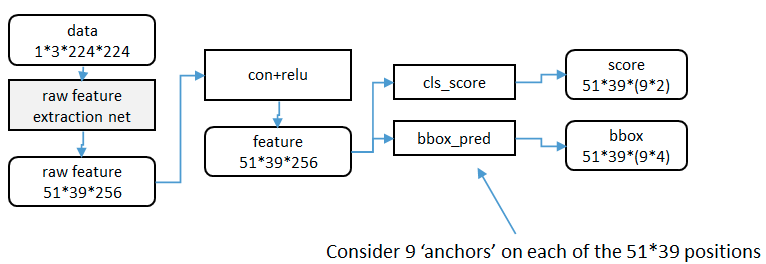 对于每个3x3的窗口,作者就计算这个滑动窗口的中心点所对应的原始图片的中心点。然后作者假定,这个3x3窗口,是从原始图片上通过SPP池化得到的,而这个池化的区域的面积以及比例,就是一个个的anchor。换句话说,对于每个3x3窗口,作者假定它来自9种不同原始区域的池化,但是这些池化在原始图片中的中心点,都完全一样。这个中心点,就是刚才提到的,3x3窗口中心点所对应的原始图片中的中心点。如此一来,在每个窗口位置,我们都可以根据9个不同长宽比例、不同面积的anchor,逆向推导出它所对应的原始图片中的一个区域,这个区域的尺寸以及坐标,都是已知的。而这个区域,就是我们想要的 proposal。所以我们通过滑动窗口和anchor,成功得到了 51x39x9 个原始图片的proposal。接下来,每个proposal我们只输出6个参数:每个 proposal 和 ground truth 进行比较得到的前景概率和背景概率(2个参数)(对应图上的 cls_score);由于每个 proposal 和 ground truth 位置及尺寸上的差异,从 proposal 通过平移放缩得到 ground truth 需要的4个平移放缩参数(对应图上的 bbox_pred)。