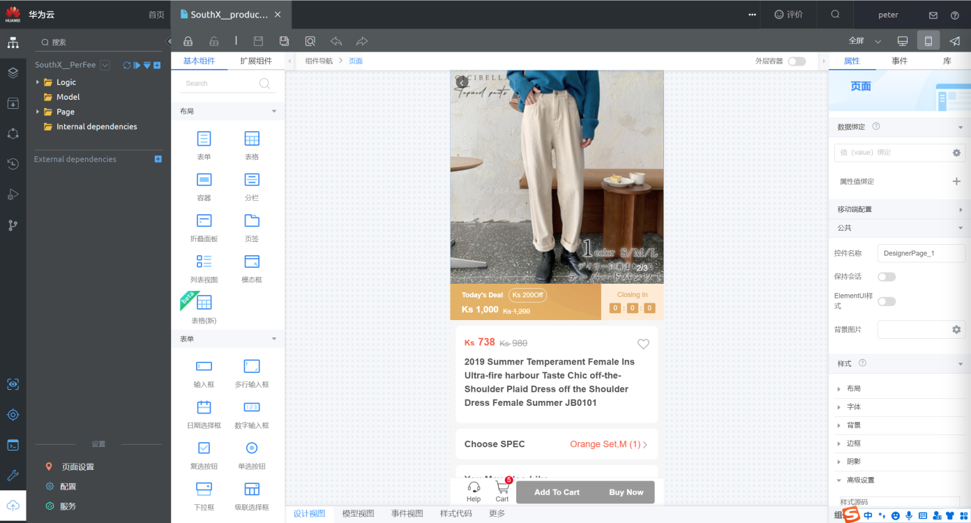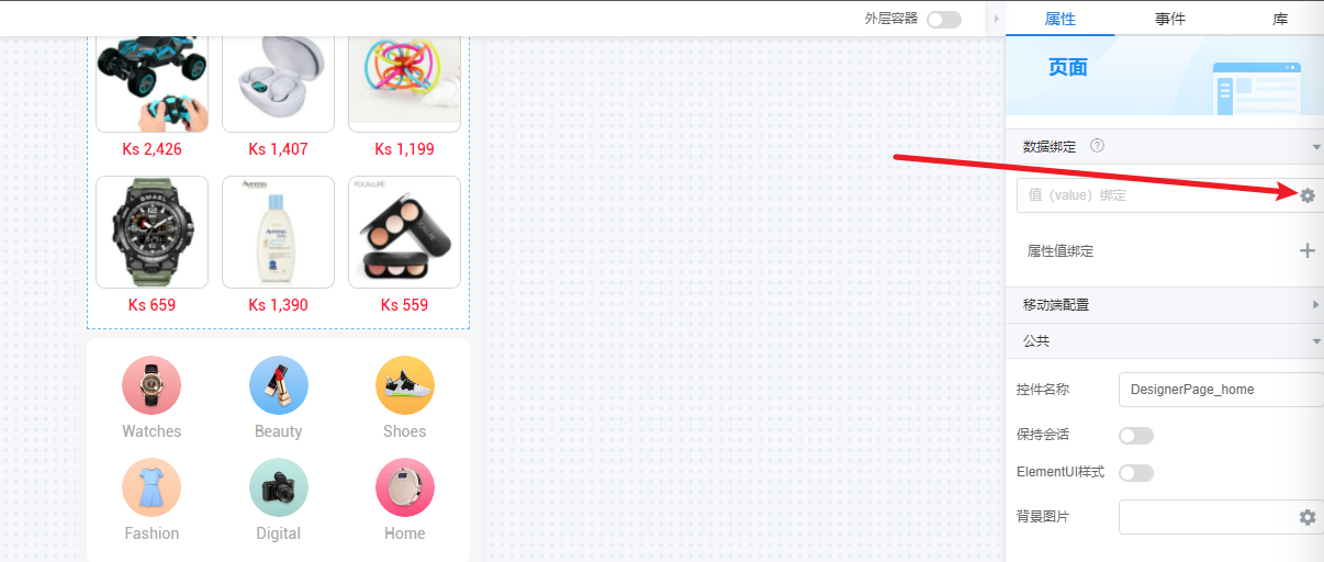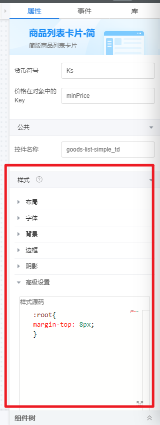 如图,在页面的属性区下方,有一个样式配置区,可以通过可视化配置样式,最终生成CSS样式源码出现在最下方的样式源码中。所以对于前端人员来说,可以直接在样式源码中写样式。