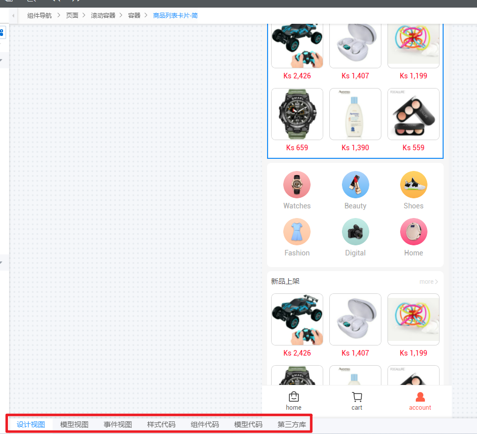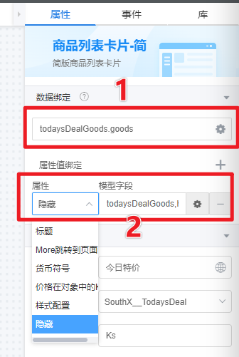 整个界面,左侧是主要菜单区,中间是可视化操作区,右侧主要是配置项。这里右侧的属性、事件和库,其实就类似Vue中的props、methods和import,比较容易理解。还有一个没有在界面中明显展示出来的概念——模型,则感觉是对应了Vue中的data,可以利用模型做数据的双向绑定。