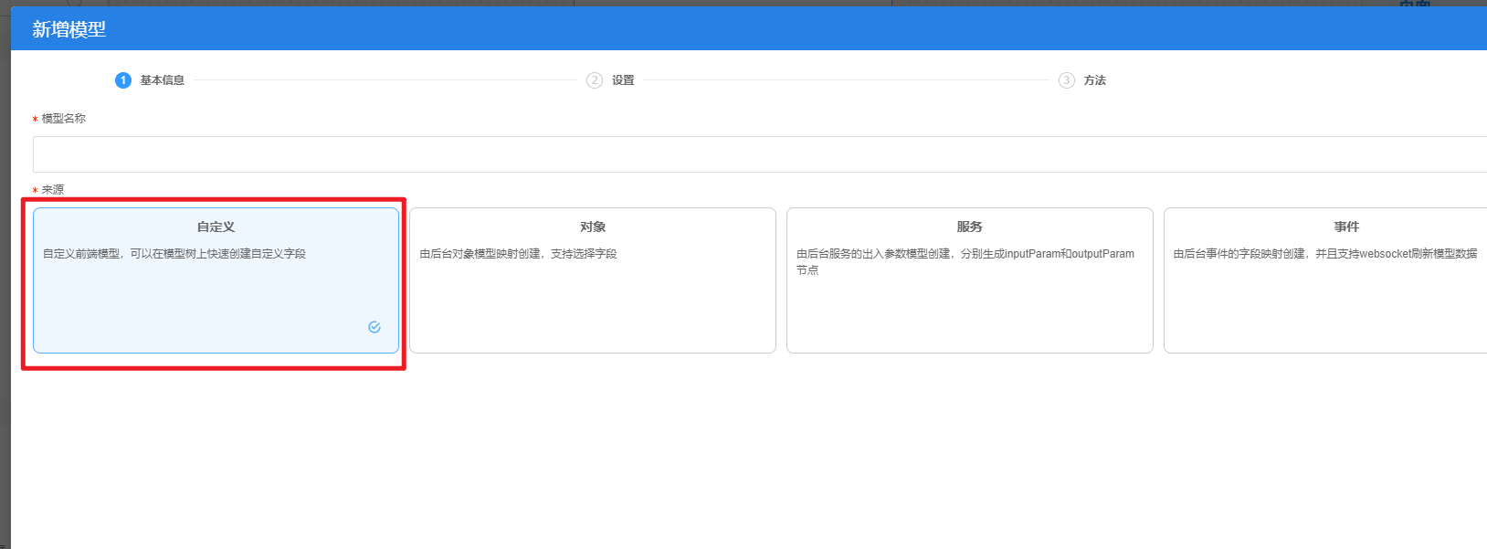 新建模型这里,像我们做纯前端开发的话,就只需要点击创建自定义模型即可。