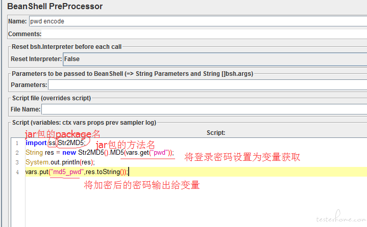 在beanshell PreProcessor中导入jar包,调用加密方法,beanshell PreProcessor最常用的方法: