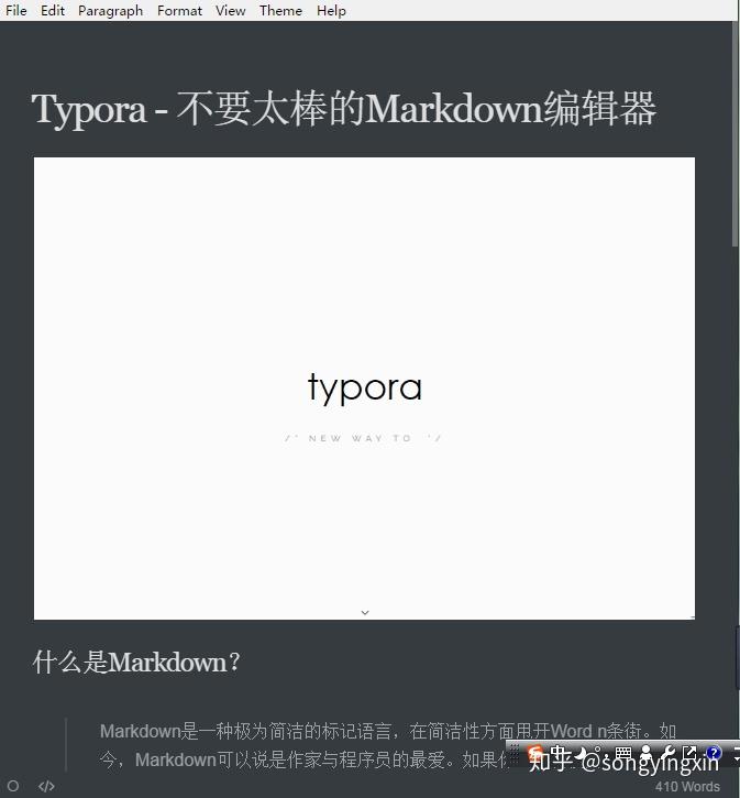 Typora的最大特性:极致简洁。 简洁到什么程度呢,像一般的编辑器像简书都是一半是编辑窗口,一半是预览窗口,而Typora将二者合一,达到极致简洁。