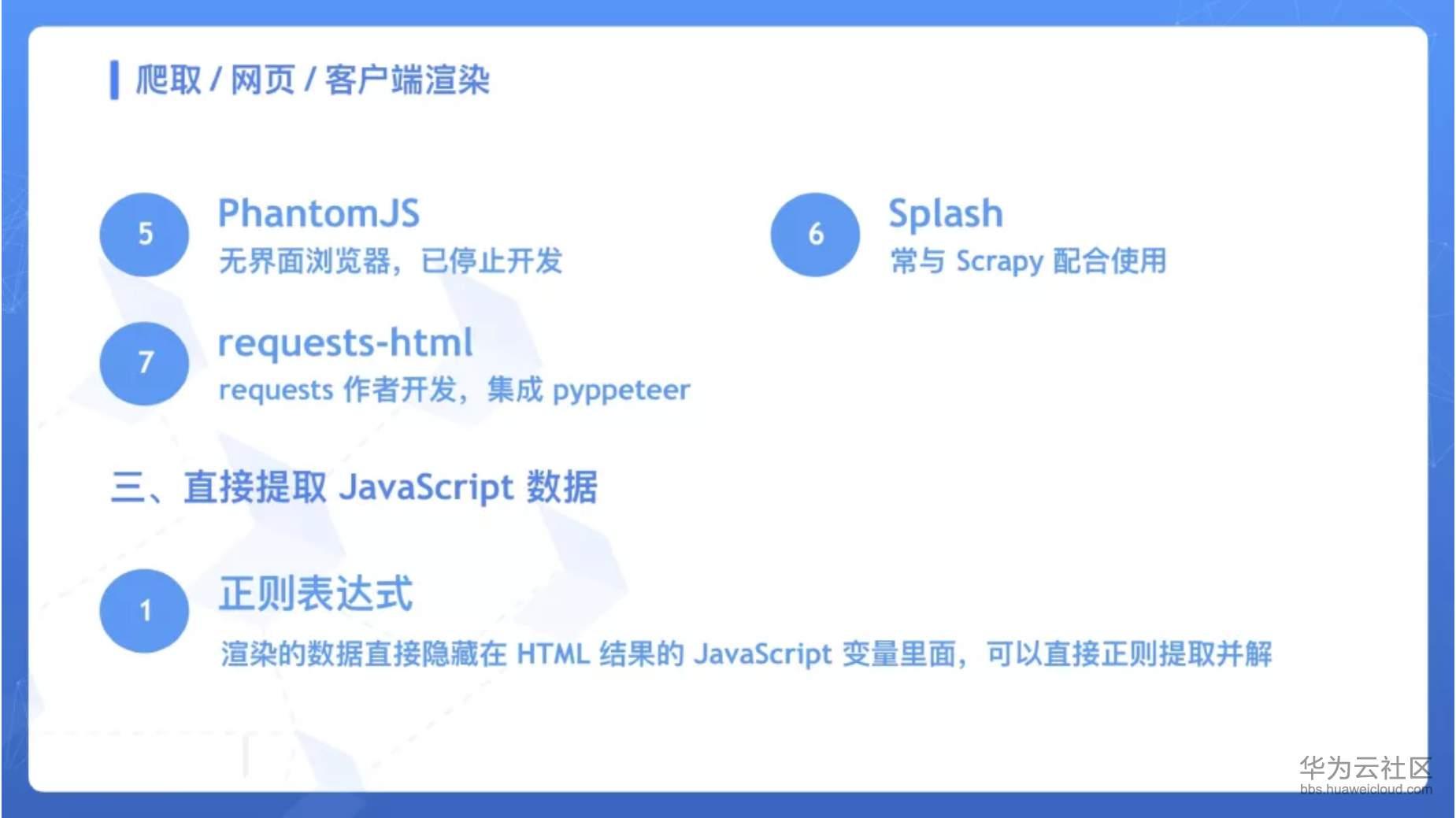 分享的主题叫做《健壮高效的网络爬虫》,本次分享从抓取、解析、存储、反爬、加速五个方面介绍了利用 Python 进行网络爬虫开发的相关知识点和技巧,介绍了不同场景下如何采取不同措施高效地进行数据抓取的方法,包括 Web 抓取、App 抓取、数据存储、代理选购、验证码破解、分布式抓取及管理、智能解析等多方面的内容,另外还结合了不同场景介绍了常用的一些工具包,全部内容是我在从事网络爬虫研究过程以来的经验精华总结。