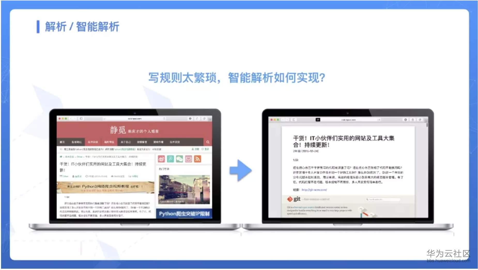 这些规则和解析方法其实写起来是很繁琐的,如果我们要爬上万个网站,如果每个网站都去写对应的规则,那么不就太累了吗?所以智能解析便是一个需求。