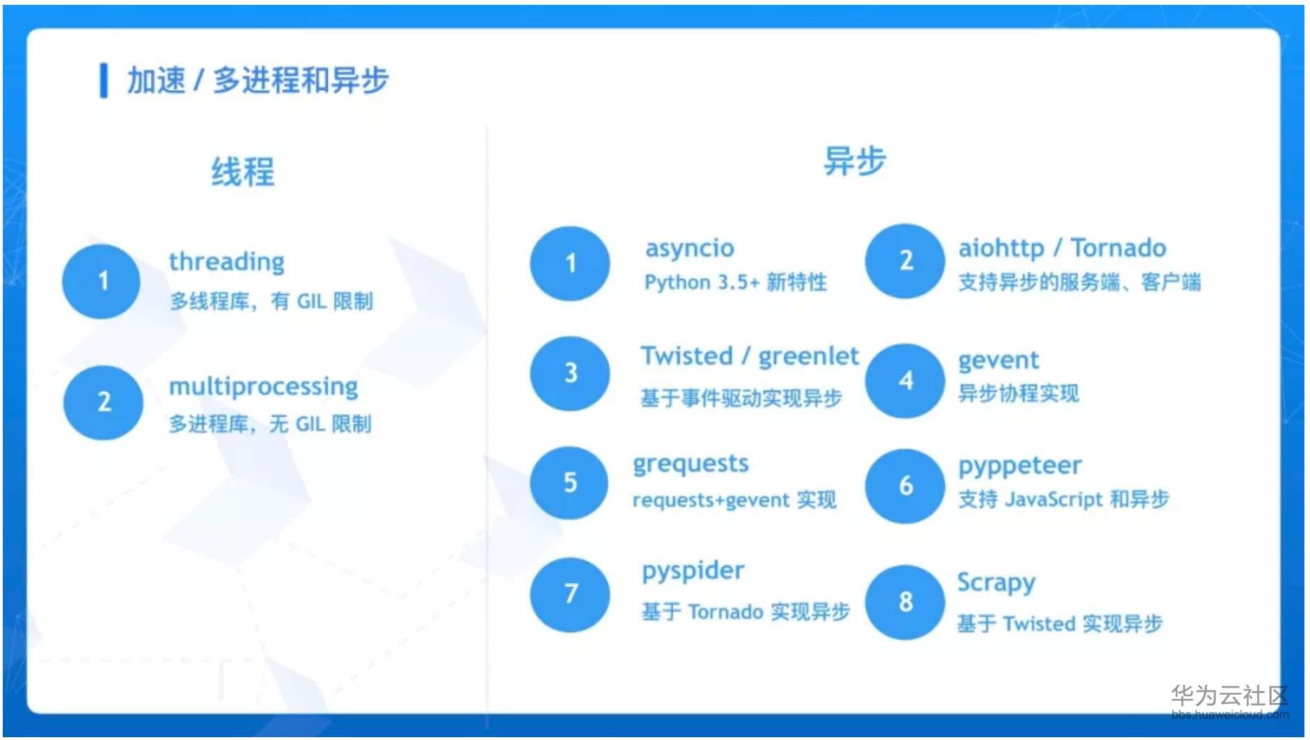 将爬取过程改成非阻塞形式,当有响应式再进行处理,否则在等待时间内可以运行其他任务,如使用 asyncio、aiohttp、Tornado、Twisted、gevent、grequests、pyppeteer、pyspider、Scrapy 等。