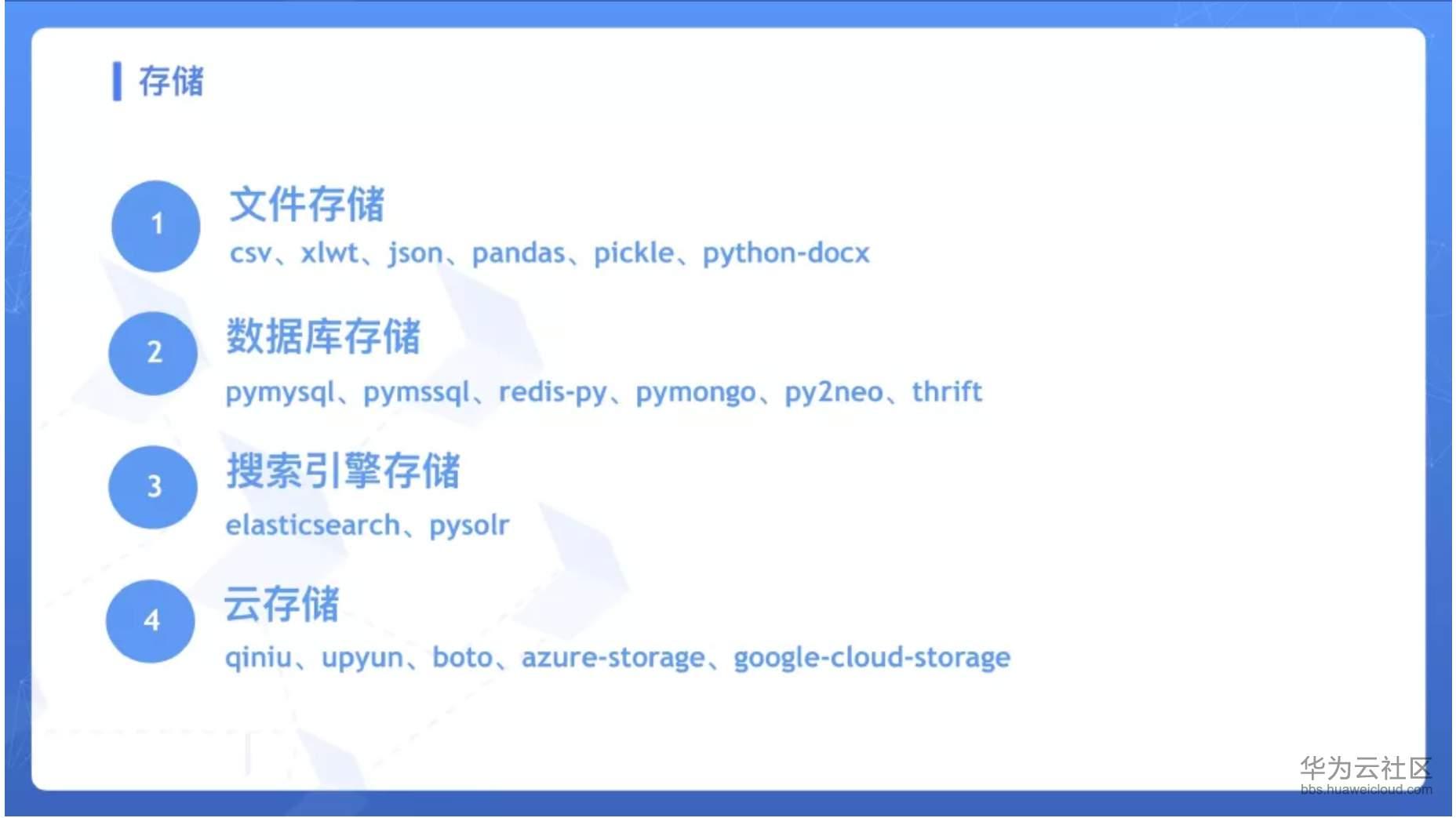 - 云存储,某些媒体文件可以存到如七⽜牛云、又拍云、阿里云、腾讯云、Amazon S3 等,常用的库有 qiniu、upyun、boto、azure-storage、google-cloud-storage 等。