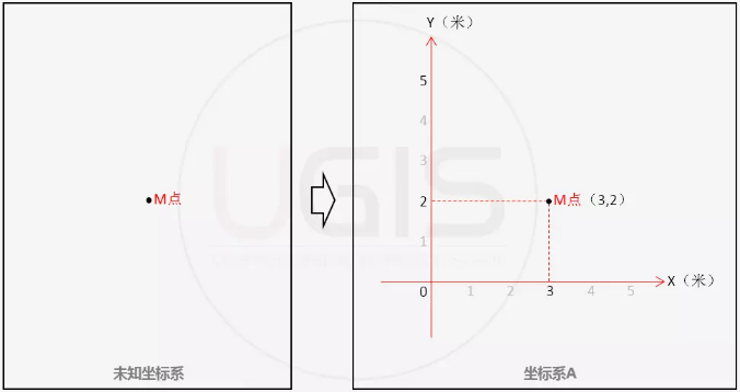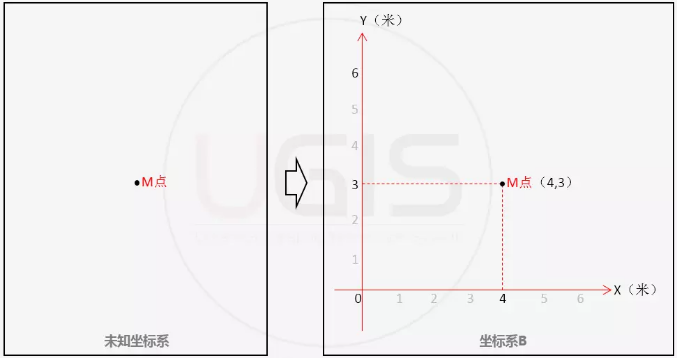 对于同一空间要素,定义不同的坐标系,其空间参考位置就会存在差异,对应的其坐标值也就不一样,如图1.1、图1.2就是同一个要素点M在两个不同坐标系下的坐标值描述,在A坐标系的空间参考下,M点的坐标值为(3,2),在B坐标系下M点的坐标值为(4,3)。