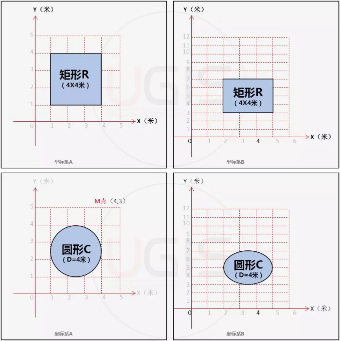 第二中方法是保持M位置不变,将坐标系A向左、向下分别移动一个单位,及将坐标系A变换为坐标系B,则M的坐标值也会变成(4,3)。