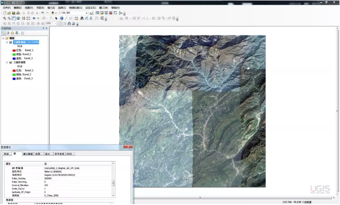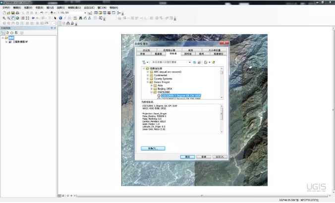 2、这里选择CGCS2000 3 Degree GK CM 102E的原因是因为我们所选择的区域正好位于经度东经102度附近,所以在实际应用中请根据实际数据所在区域选择离其最近的中央经线投影带即可。(末尾的102E即表示该投影带对应的中央经线)