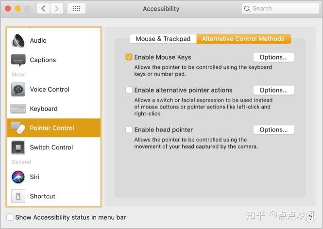 如果愿意,还可以按选项+命令+ F5带来辅助功能快捷方式。从这里,您可以快速启用和禁用鼠标键。