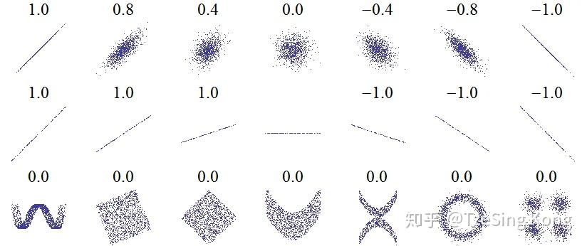 因为样本间没有线性相关性,可能会杂乱无章(即什么关系也没有),也可能呈现出一些非线性关系(更高阶的关系Pearson相关系数并不能表示出来)