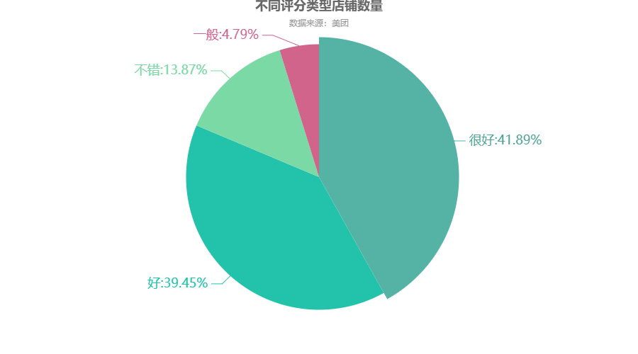 df4 = df.groupby(\'评分类型\')[\'店铺名称\'].count() df4 = df4.sort_values(ascending=False) regions = df4.index.to_list() values = df4.to_list() c = ( Pie(init_opts=opts.InitOpts(theme=ThemeType.WONDERLAND)) .add("", zip(regions,values)) .set_global_opts(title_opts=opts.TitleOpts(title="不同评分类型店铺数量",subtitle="数据来源:美团",pos_top="-1%",pos_left = \'center\')) .set_series_opts(label_opts=opts.LabelOpts(formatter="{b}:{d}%",font_size=18)) ) c.render_notebook()