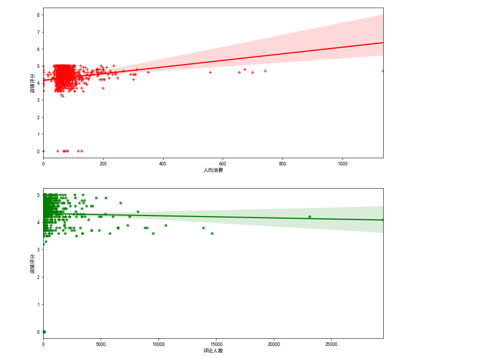 import matplotlib.pyplot as plt import seaborn as sns %matplotlib inline plt.rcParams[\'font.sans-serif\'] = [\'SimHei\'] # 设置加载的字体名 plt.rcParams[\'axes.unicode_minus\'] = False # 解决保存图像是负号\'-\'显示为方块的问题 fig,axes=plt.subplots(2,1,figsize=(12,12)) sns.regplot(x=\'人均消费\',y=\'店铺评分\',data=df,color=\'r\',marker=\'+\',ax=axes[0]) sns.regplot(x=\'评论人数\',y=\'店铺评分\',data=df,color=\'g\',marker=\'*\',ax=axes[1])