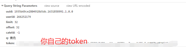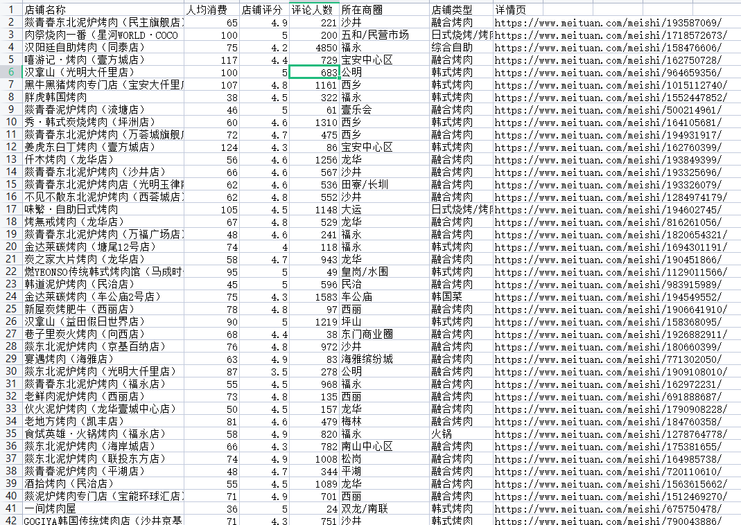 for page in range(0, 1537, 32): # time.sleep(2) url = \'https://apimobile.meituan.com/group/v4/poi/pcsearch/30\' data = { \'uuid\': \'96d0bfc90dfc441b81fb.1630669508.1.0.0\', \'userid\': \'266252179\', \'limit\': \'32\', \'offset\': page, \'cateId\': \'-1\', \'q\': \'烤肉\', \'token\': \'你自己的token\', } headers = { \'Referer\': \'https://sz.meituan.com/\', \'User-Agent\': \'Mozilla/5.0 (Windows NT 10.0; Win64; x64) AppleWebKit/537.36 (KHTML, like Gecko) Chrome/91.0.4472.124 Safari/537.36\' } response = requests.get(url=url, params=data, headers=headers) result = response.json()[\'data\'][\'searchResult\'] for index in result: shop_id = index[\'id\'] index_url = f\'https://www.meituan.com/meishi/{shop_id}/\' dit = { \'店铺名称\': index[\'title\'], \'人均消费\': index[\'avgprice\'], \'店铺评分\': index[\'avgscore\'], \'评论人数\': index[\'comments\'], \'所在商圈\': index[\'areaname\'], \'店铺类型\': index[\'backCateName\'], \'详情页\': index_url, } csv_writer.writerow(dit) print(dit) f = open(\'美团烤肉数据.csv\', mode=\'a\', encoding=\'utf-8\', newline=\'\') csv_writer = csv.DictWriter(f, fieldnames=[ \'店铺名称\', \'人均消费\', \'店铺评分\', \'评论人数\', \'所在商圈\', \'店铺类型\', \'详情页\', ]) csv_writer.writeheader()