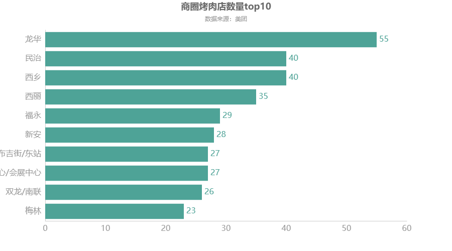 df2 = df.groupby(\'所在商圈\')[\'店铺名称\'].count() df2 = df2.sort_values(ascending=True)[-10:] df2 = df2.round(2) c = ( Bar(init_opts=opts.InitOpts(theme=ThemeType.WONDERLAND)) .add_xaxis(df2.index.to_list()) .add_yaxis("",df2.to_list()).reversal_axis() #X轴与y轴调换顺序 .set_global_opts(title_opts=opts.TitleOpts(title="商圈烤肉店数量top10",subtitle="数据来源:美团",pos_left = \'center\'), xaxis_opts=opts.AxisOpts(axislabel_opts=opts.LabelOpts(font_size=16)), #更改横坐标字体大小 yaxis_opts=opts.AxisOpts(axislabel_opts=opts.LabelOpts(font_size=16)), #更改纵坐标字体大小 ) .set_series_opts(label_opts=opts.LabelOpts(font_size=16,position=\'right\')) ) c.render_notebook()