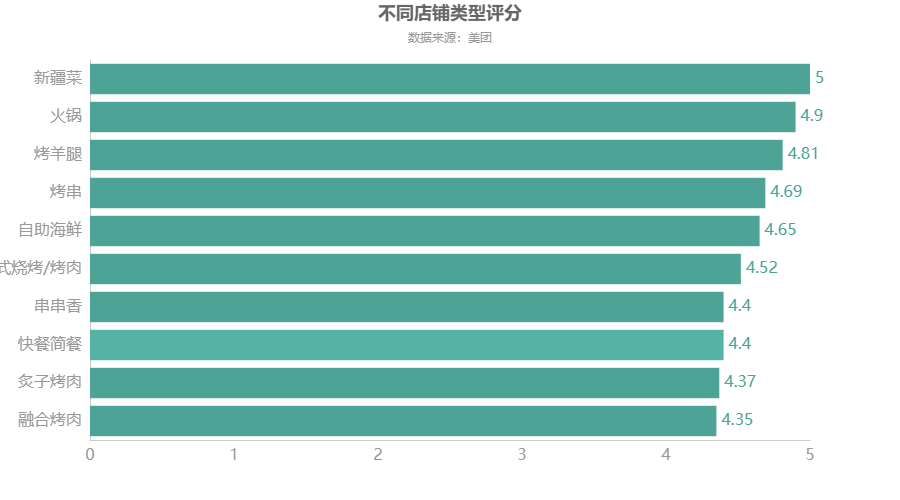 df6 = df.groupby(\'店铺类型\')[\'店铺评分\'].mean() df6 = df6.sort_values(ascending=True) df6 = df6.round(2) df6 = df6.tail(10) c = ( Bar(init_opts=opts.InitOpts(theme=ThemeType.WONDERLAND)) .add_xaxis(df6.index.to_list()) .add_yaxis("",df6.to_list()).reversal_axis() #X轴与y轴调换顺序 .set_global_opts(title_opts=opts.TitleOpts(title="不同店铺类型评分",subtitle="数据来源:美团",pos_left = \'center\'), xaxis_opts=opts.AxisOpts(axislabel_opts=opts.LabelOpts(font_size=16)), #更改横坐标字体大小 yaxis_opts=opts.AxisOpts(axislabel_opts=opts.LabelOpts(font_size=16)), #更改纵坐标字体大小 ) .set_series_opts(label_opts=opts.LabelOpts(font_size=16,position=\'right\')) ) c.render_notebook()