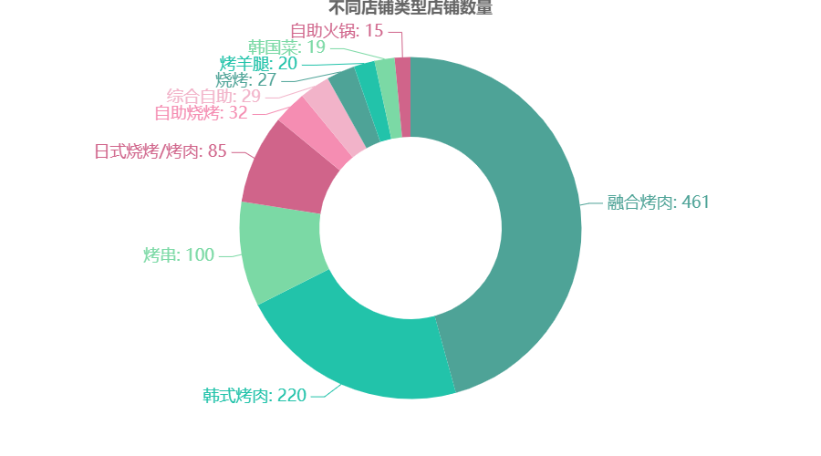 df6 = df.groupby(\'店铺类型\')[\'店铺名称\'].count() df6 = df6.sort_values(ascending=False)[:10] df6 = df6.round(2) regions = df6.index.to_list() values = df6.to_list() c = ( Pie(init_opts=opts.InitOpts(theme=ThemeType.WONDERLAND)) .add("", zip(regions,values),radius=["40%", "75%"]) .set_global_opts(title_opts=opts.TitleOpts(title="不同店铺类型店铺数量",pos_top="-1%",pos_left = \'center\')) .set_series_opts(label_opts=opts.LabelOpts(formatter="{b}: {c}",font_size=18)) ) c.render_notebook()