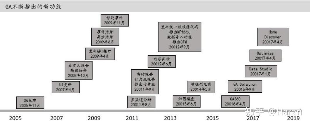 可以看到,目前使用比较广泛的自定义报告、高级细分和事件跟踪等功能在2008年~2009年就已经推出,而GTM则是在2012年才发布,增强型电子商务则是2014年才发布。还可以看到,近几年,GA上的更新有所减少,而作为独立产品发布的却越来越多,如Data Sutdio和Optimize,形成了GA Solution。