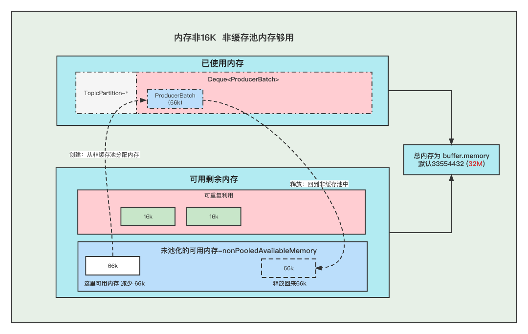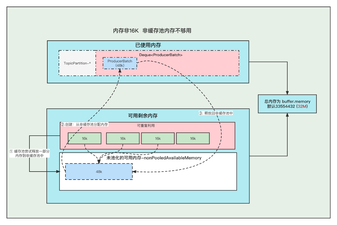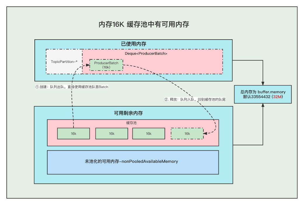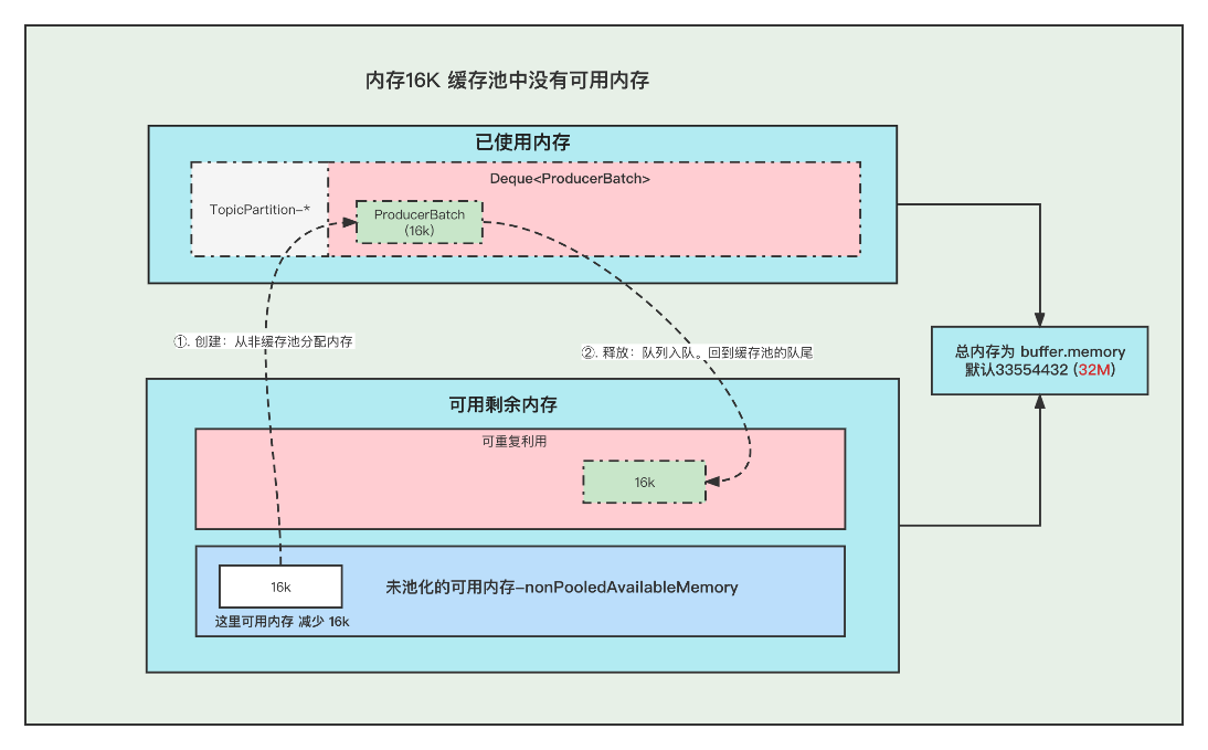 ①. 创建Batch的时候, 去非缓存池中的内存获取一部分内存用于创建Batch. 注意:这里说的获取内存给Batch, 其实就是让 非缓存池nonPooledAvailableMemory 减少 16K 的内存, 然后Batch正常创建就行了, 不要误以为好像真的发生了内存的转移。