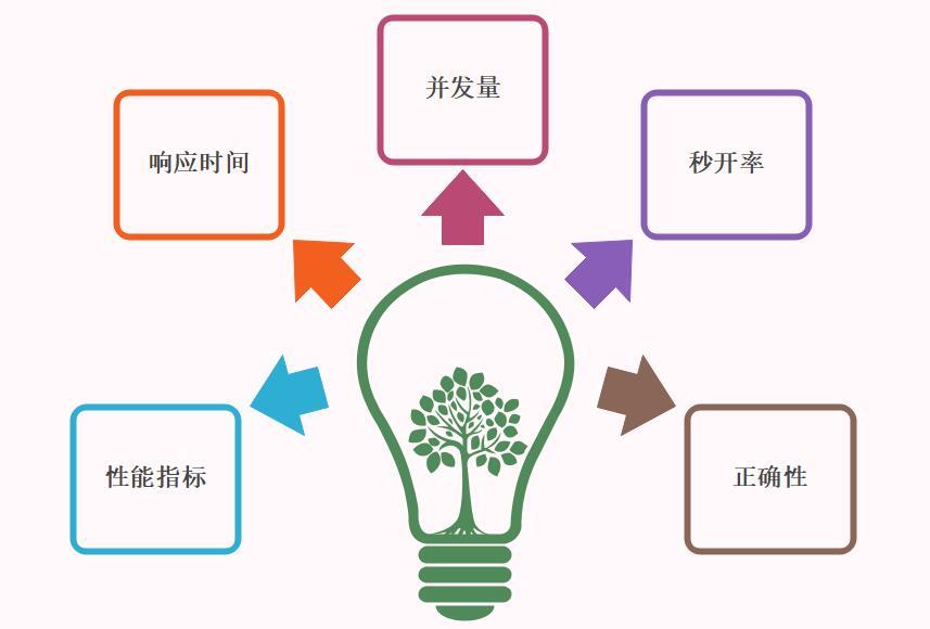 对于性能优化来说,衡量的指标有很多,大体上可以分为:性能指标、响应时间、并发量、秒开率和正确性等。我们可以使用下图来表示这些衡量指标。