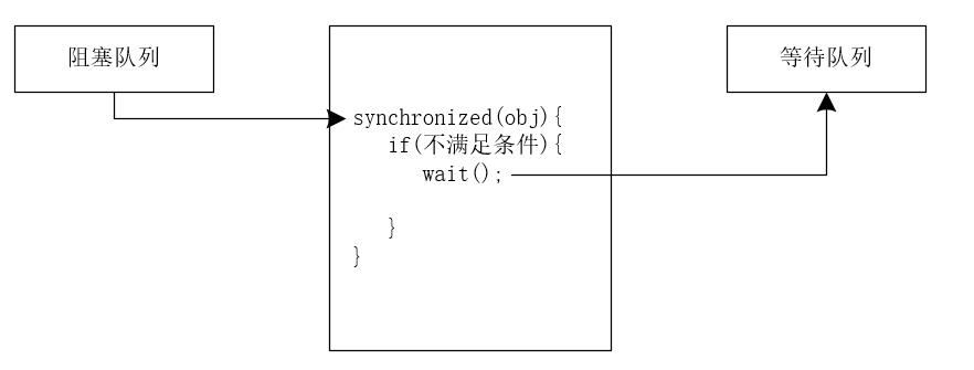 在并发编程中,如果一个线程获得了synchronized互斥锁,但是不满足继续向下执行的条件,则需要进入等待状态。此时,可以使用Java中的wait()方法来实现。当调用wait()方法后,当前线程就会被阻塞,并且会进入一个等待队列中进行等待,这个由于调用wait()方法而进入的等待队列也是互斥锁的等待队列。而且,线程在进入等待队列的同时,会释放自身获得的互斥锁,这样,其他线程就有机会获得互斥锁,进而进入临界区了。整个过程可以表示成下图所示。