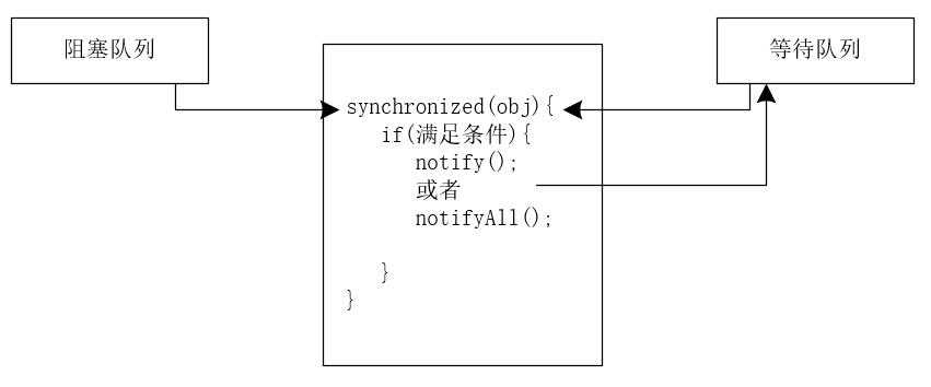 当线程执行的条件满足时,可以使用Java提供的notify()和notifyAll()方法来通知互斥锁等待队列中的线程,我们可以使用下图来简单的表示这个过程。