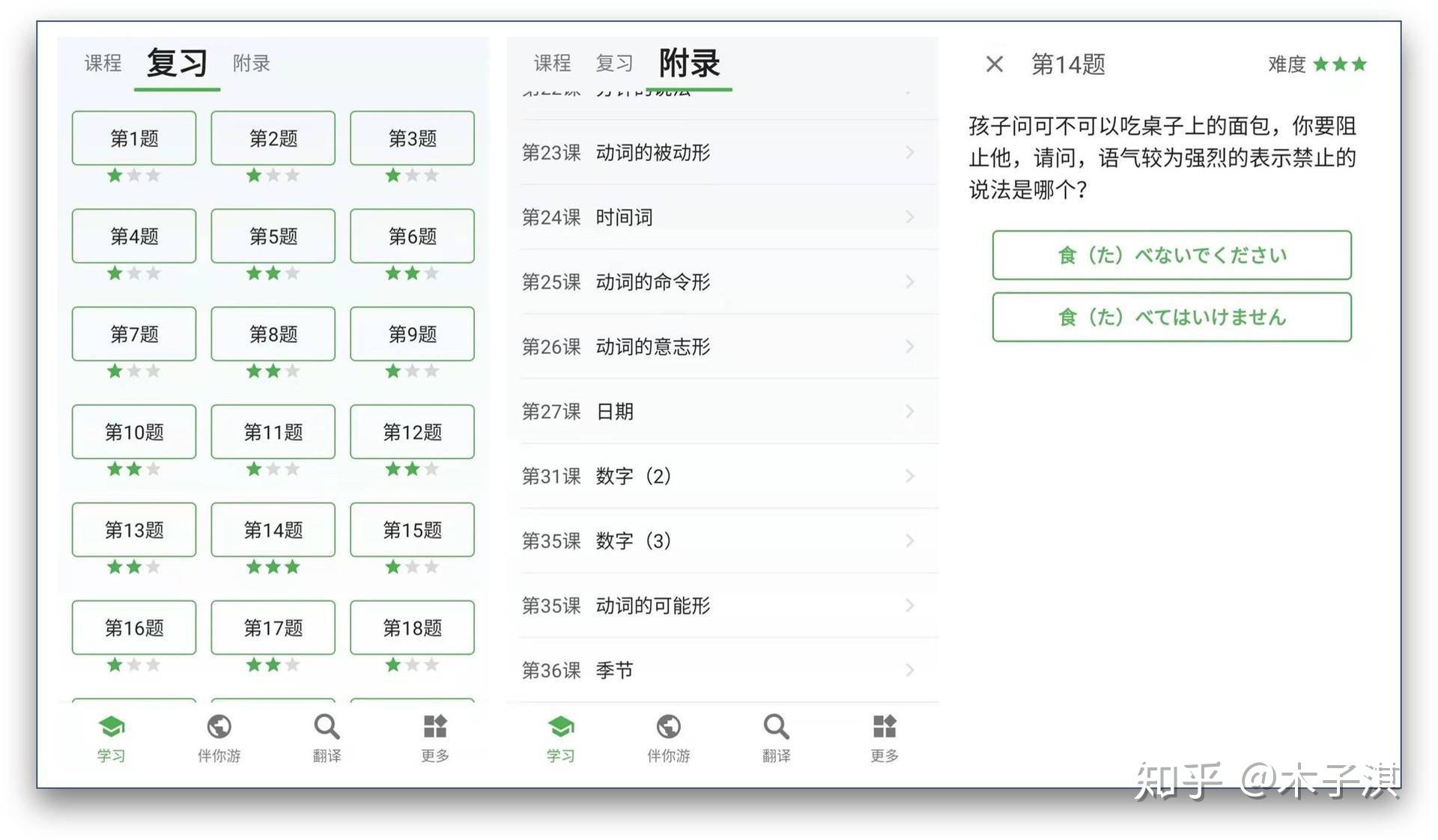 它的附录版块提供了各种基础语法学习功能,包括:数字、量词、时刻、星期、动词的辞书形、月、形容词的否定形、形容词的过去形、分钟的说法、动词的被动形、时间词、动词的命令形、动词的意志形、日期、动词的可能形、季节。