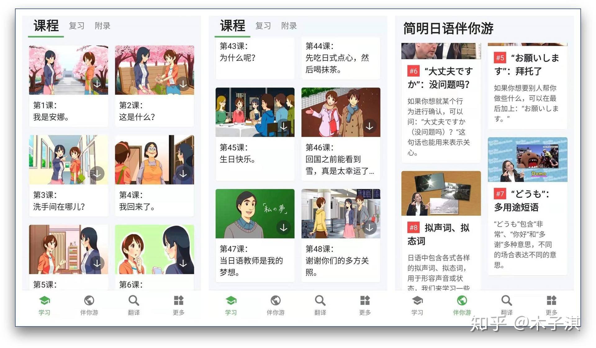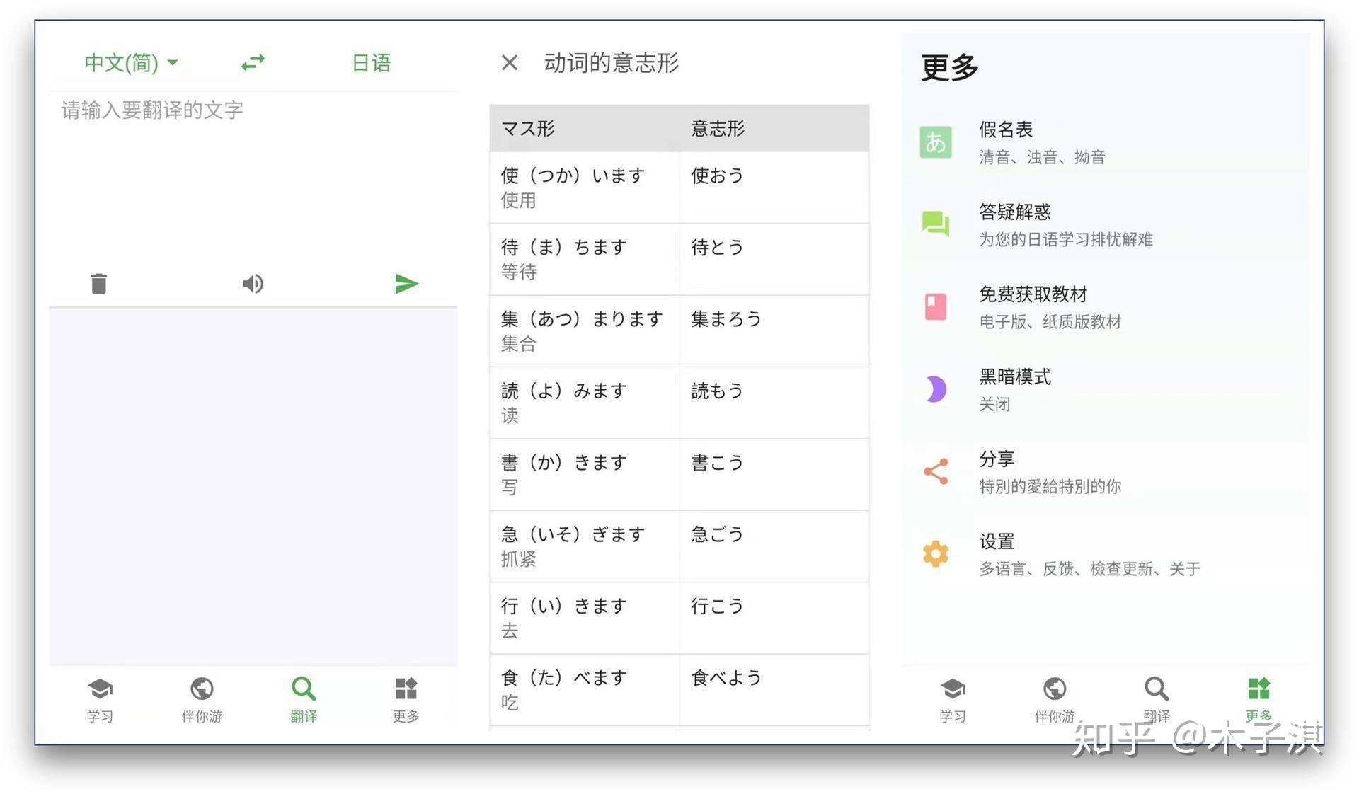 它支持翻译功能,支持假名表功能,支持答疑解惑,支持免费获取教材,支持黑暗模式。