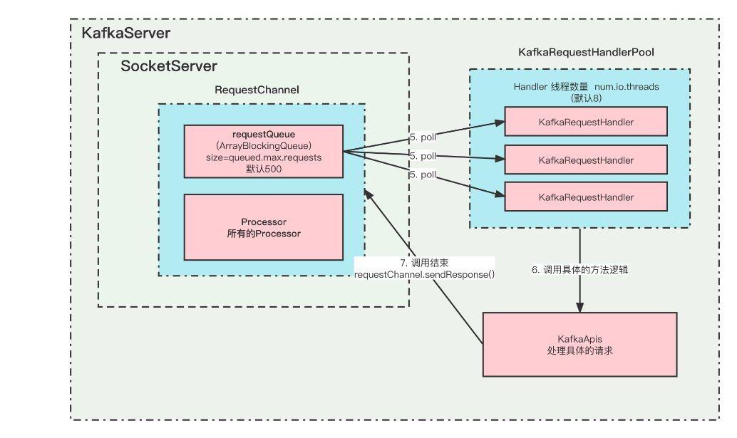 - KafkaRequestHandlerPool中创建了很多(num.io.threads(默认8))的KafkaRequestHandler,用来处理Request, 他们都会一直从RequestChannel中的requestQueue队列中poll新的Request,来进行处理。