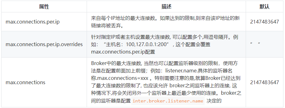简单来说就是:就算Broker已经达到了最大连接数的限制了, 也应该允许 broker之间监听器上的连接, 这种情况下,将会关闭另外一个监听器上最近最少使用的连接。broker之间的监听器是配置inter.broker.listener.name 决定的