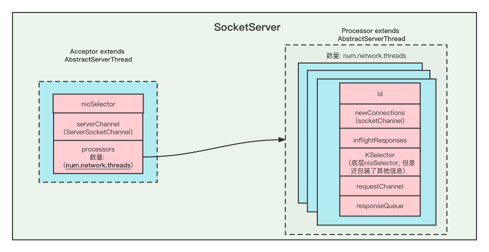 Acceptor 线程类:继承自AbstractServerThread, 这是接收和创建外部 TCP 连接的线程。每个 SocketServer 实例一般会创建一个 Acceptor 线程(如果listeners配置了多个就会创建多个Acceptor)。它的唯一目的就是创建连接,并将接收到的 SocketChannel(SocketChannel通道用于传输数据) 传递给下游的 Processor 线程处理,Processor主要是处理连接之后的事情,例如读写I/O。