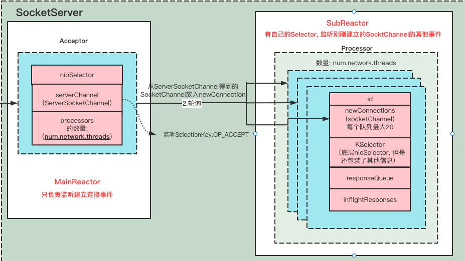 MainReactor(Acceptor)只负责监听OP_ACCEPT事件, 监听到之后把SocketChannel 传递给 SubReactor(Processor), 每个Processor都有自己的Selector。SubReactor会监听并处理其他的事件,并最终把具体的请求传递给KafkaRequestHandlerPool。