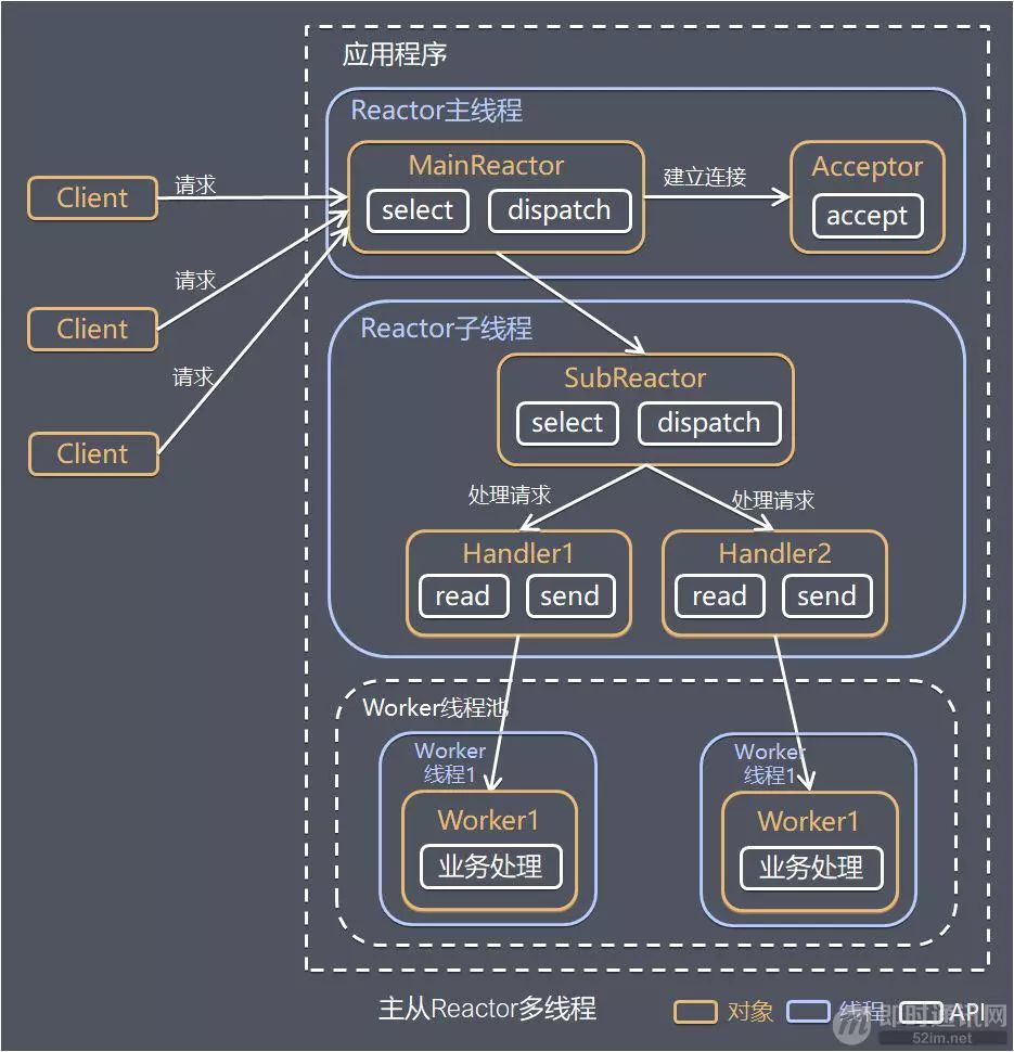 - Handler 通过 Read 读取数据后,会分发给后面的 Worker 线程池进行业务处理;