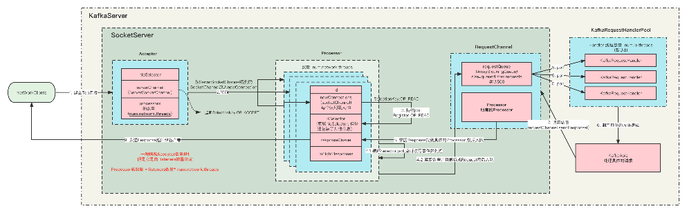 通过serverSocketChannel.accept()方法可以拿到SocketChannel通道用于传输数据。 - 每个Processor 线程都有一个唯一的id,并且通过Acceptor拿到的SocketChannel会被暂时放入到