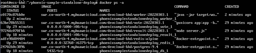 在编译构建环节,我们已经成功将三个功能模块镜像(vote、result、worker)和两个第三方镜像构建并上传至SWR(容器镜像仓库)中了。接下来需要做的就是将SWR中的镜像拉取到我们的部署主机并启动。